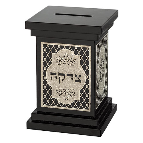 Na frente está uma elegante placa ornamental prateada com um bonito desenho de diamantes e a palavra "tsedacá" - caridade - escrita destacada em hebraico na frente.