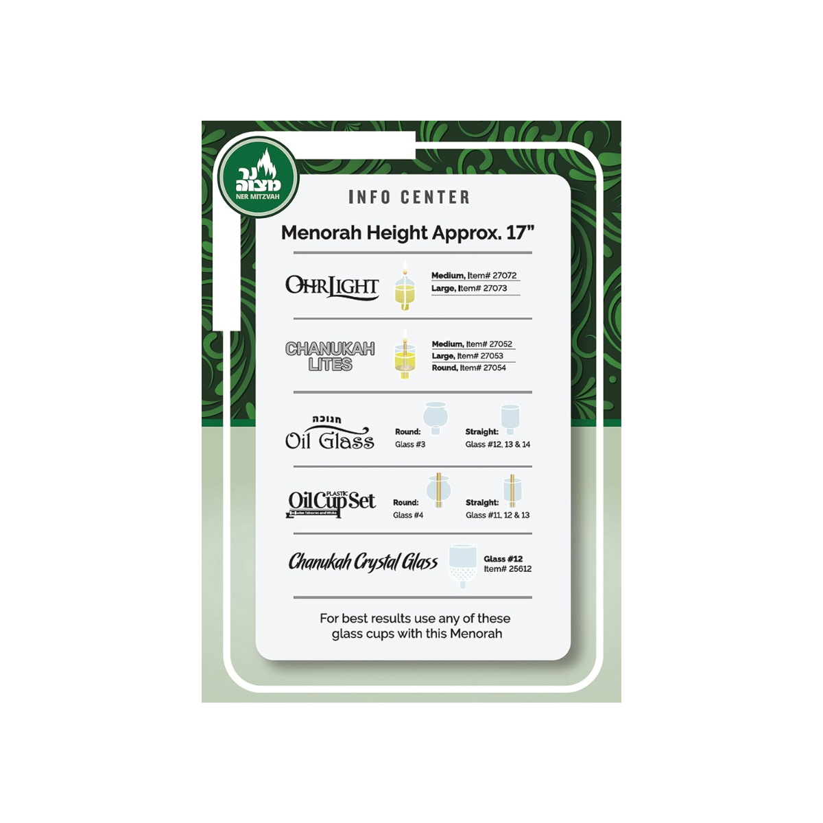 TAMANHO: 29,8 cm de largura (11,75") x 42 cm de altura (16,5"). Tamanho do copo: 2,54 cm (1"). Compatível com copos de óleo grandes e Ohr lights pré-preenchidos (tamanhos pequeno e médio). Também acomoda velas grandes e grossas, incluindo velas de Shabat e afiladas. Copos, velas e óleo vendidos separadamente.