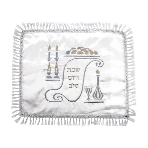 Linda cobertura para Chalá em cetim, bordada com desenhos de candelabro, copo de kidush e vinho e inscrições em hebraico "Shabat e Yom Tov".