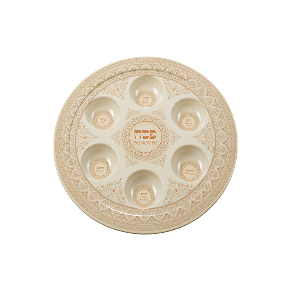 Ele adiciona um toque de elegância à sua mesa de jantar durante a celebração. Os nomes dos elementos estão escritos em hebraico e inglês, o que facilita a identificação do elementos e ajuda a manter a tradição do Pêssach.