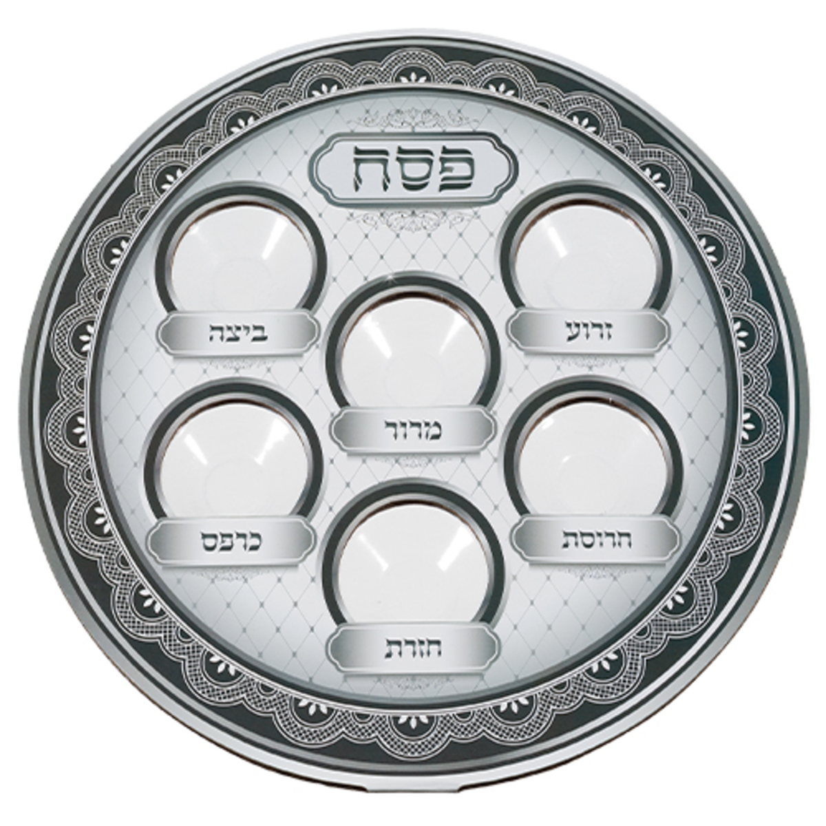 Prato para Sêder de Pêssach de papel-cartão e plástico com seis círculos que designam o local de cada elemento utilizado no Sêder com os nomes escritos em hebraico. Na parte superior está escrito Pêssach.