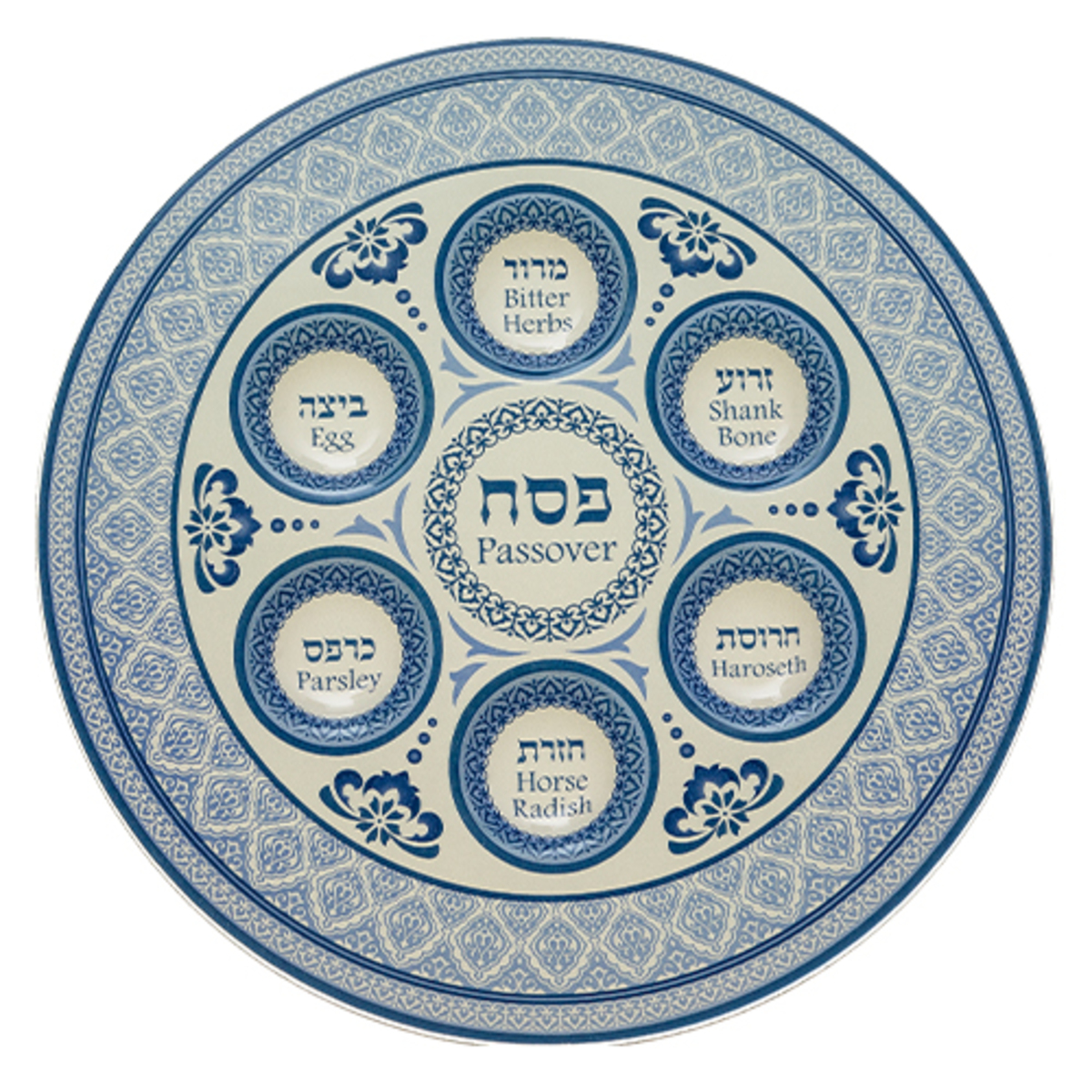 Prato para Sêder de Pêssach de Vidro com seis círculos que designam o local de cada elemento utilizado no Sêder com os nomes escritos em hebraico e inglês. No centro está escrito Pêssach.