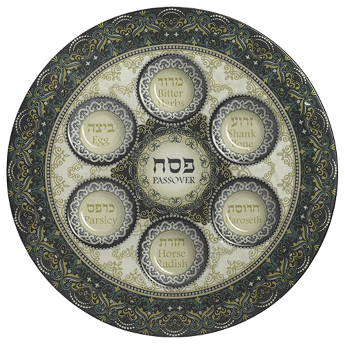 Prato para Sêder de Pêssach de Vidro com seis círculos que designam o local de cada elemento utilizado no Sêder com os nomes escritos em hebraico e inglês. No centro está escrito Pêssach.