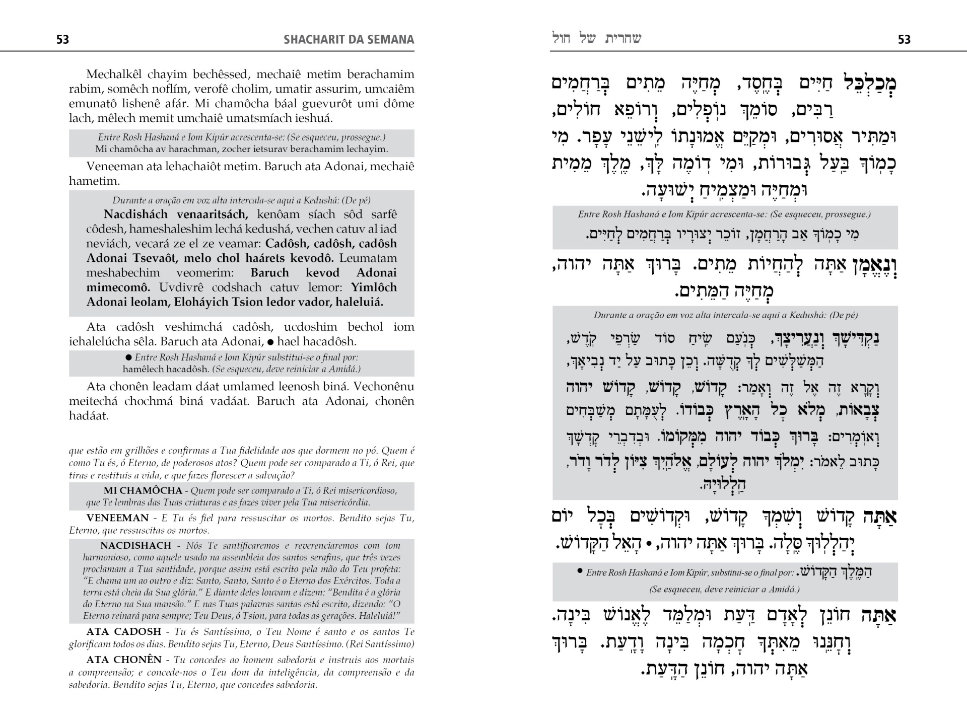 Para tanto, são apresentadas as rezas para os dias da semana, Shabat e festas judaicas de acordo com o rito Sefaradi - com particularidades e leves variações em uso nas congregações sefaraditas brasileiras - em 3 versões, lado a lado: o texto em hebraico - totalmente produzido no Brasil -, sua transliteração em caracteres latinos e sua tradução, a fim de que tanto os versados no idioma sagrado como aqueles que ainda não o são possam rezar juntos e compreender o que dizem.